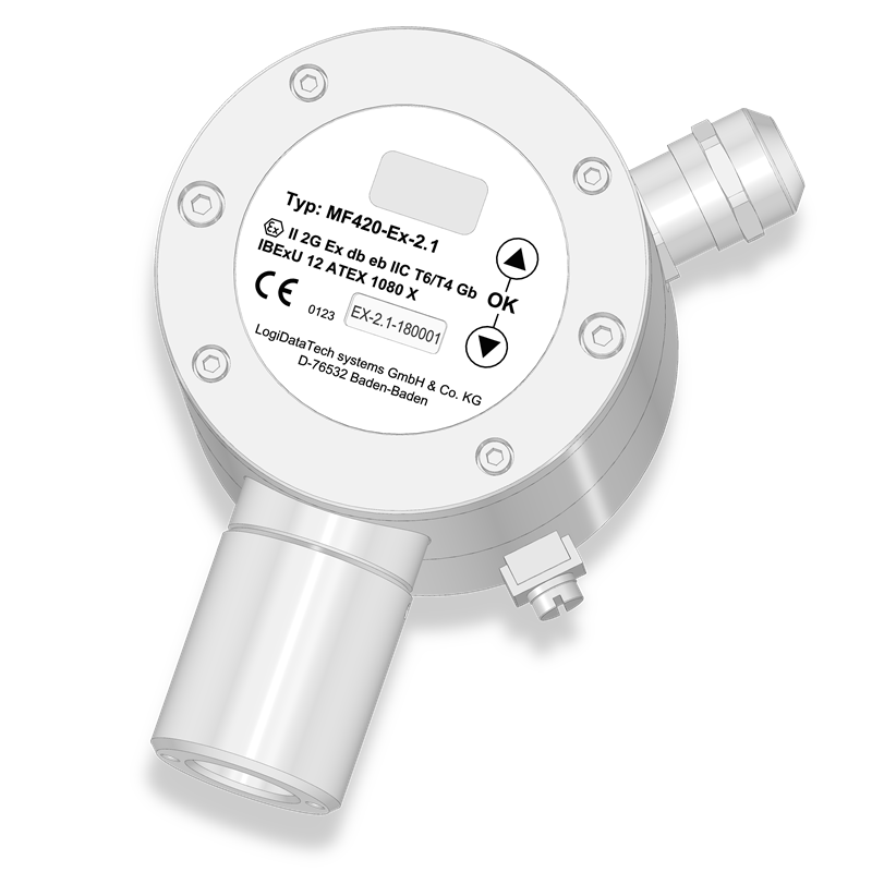 Der Messfühler MF420-Ex-2.1 ist für den Betrieb in explosionsgefährdeten Bereichen der Zone 1 und Zone 2 zugelassen und besitzt eine EG-Baumuster­prüfbescheinigung gemäß der Richtlinie 2014/34/EU (ATEX) mit folgendem Zertifikat und Kennzeichnung: